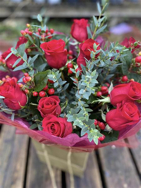 A striking bouquet of premium red roses surrounded by glossy berries and fragrant eucalyptus. Bold, elegant and full of heartfelt sentiment — the perfect expression of love and passion.