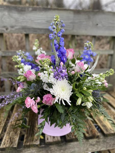 A refined hatbox arrangement with pastel pink, lilac, and blue blooms. Designed with soft height and natural flow, creating a timeless floral display full of gentle elegance.