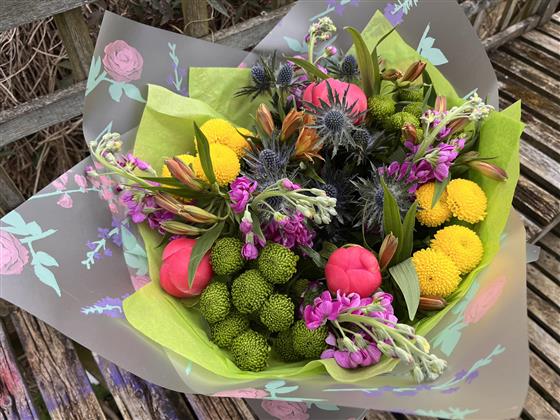 A creative hand-tied bouquet with striking textures and vibrant tones. Featuring pops of yellow, pink, green, and thistle blue, a truly modern design with artistic flair.