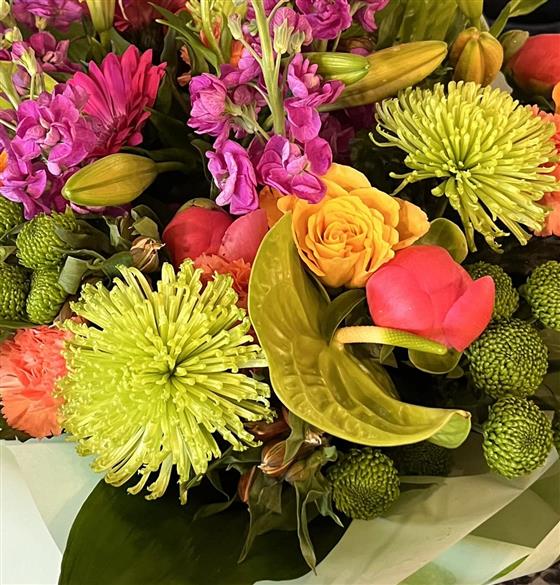 A bold and vibrant bouquet bursting with colour and life. Featuring tropical-style blooms and lush foliage, it’s designed to make a statement and bring instant joy.