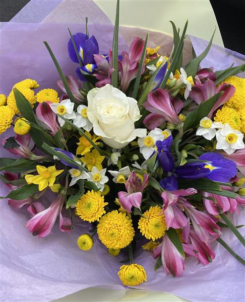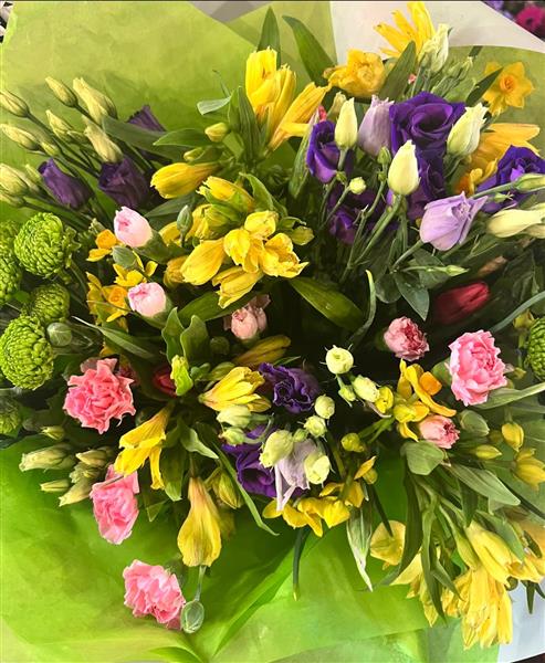 A cheerful hand-tied bouquet filled with the best blooms of spring. Freshly arranged in soft seasonal colours, bursting with fragrance and natural charm, perfect for brightening any day.