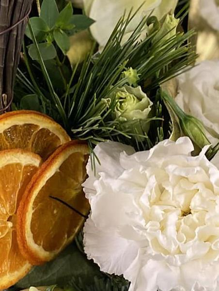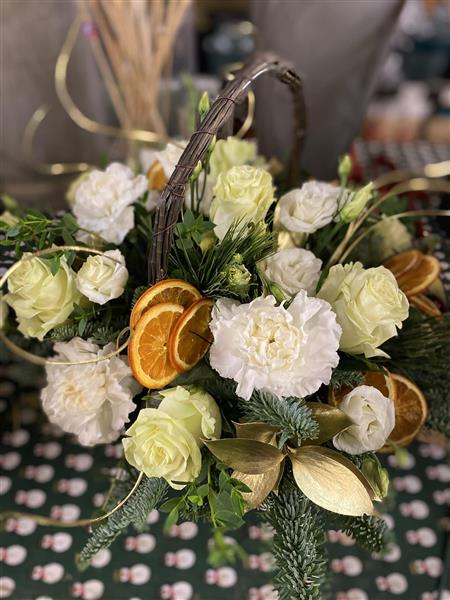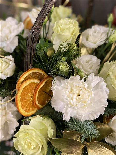 A luxurious festive basket of white blooms, fragrant evergreens and dried orange slices, accented with golden foliage. A natural and stylish design full of winter warmth and seasonal charm.