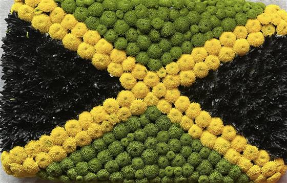 A bespoke funeral tribute created in the design of the Jamaican flag. Handcrafted with vibrant green, yellow, and black blooms to honour heritage, pride, and personal connection.