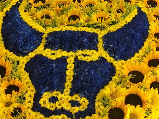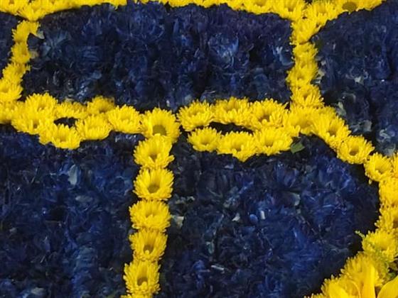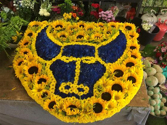 A bespoke funeral tribute inspired by Oxford United’s emblem and colours. Created with bold yellow and blue blooms, finished with vibrant sunflowers to celebrate lasting pride and passion for the U's! Yelllows!