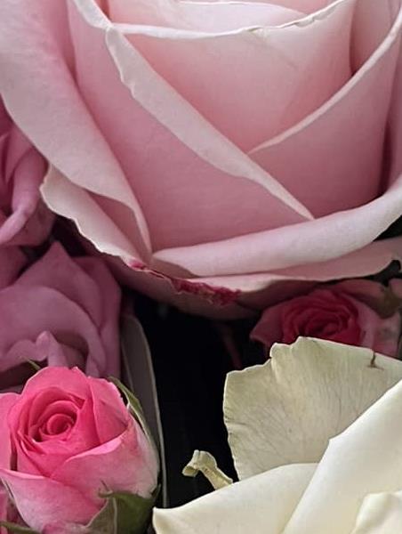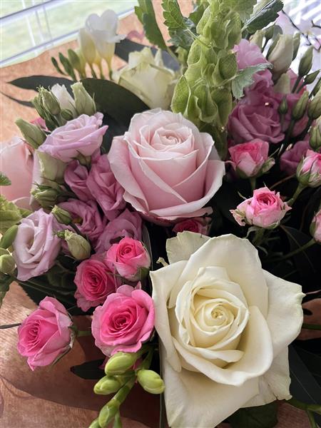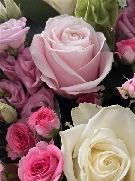A delicate arrangement of soft pinks and ivory tones, featuring roses, lisianthus and fresh foliage. Gentle, graceful and full of natural charm — a bouquet for every heartfelt moment.