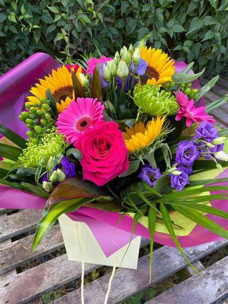 A vibrant hand-tied bouquet bursting with colour and cheer. Featuring bold sunflowers, hot pinks and vivid greens, it’s a perfect choice to brighten any day in style.