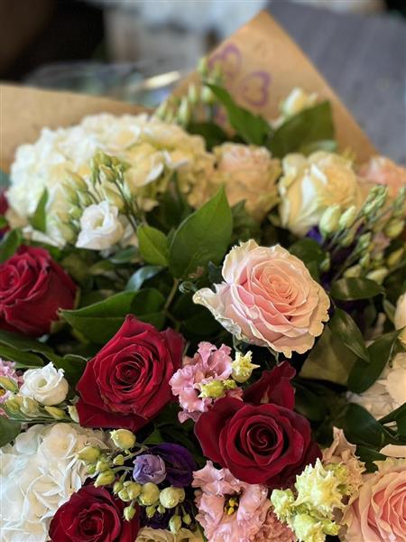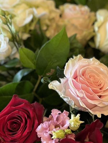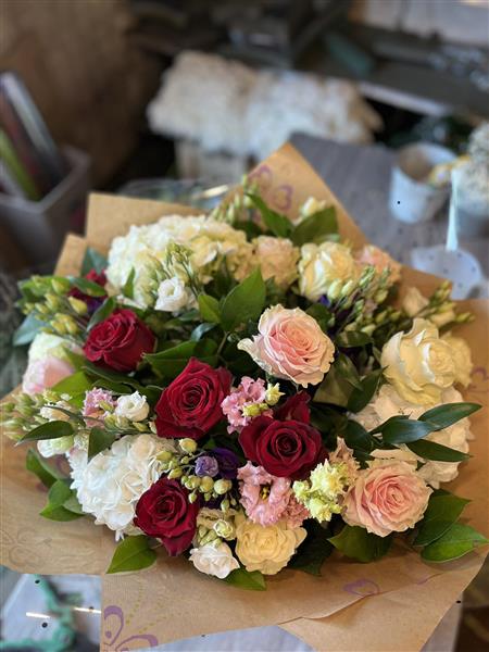 A luxurious bouquet combining deep red, soft pink and ivory blooms with lush foliage. Elegant and full of meaning, this arrangement makes a truly heartfelt gift for any special occasion.