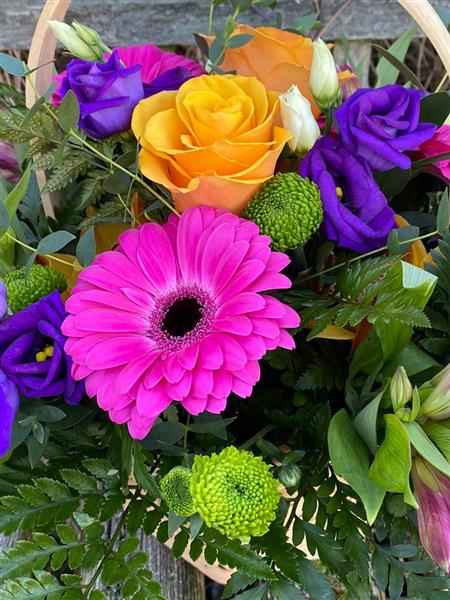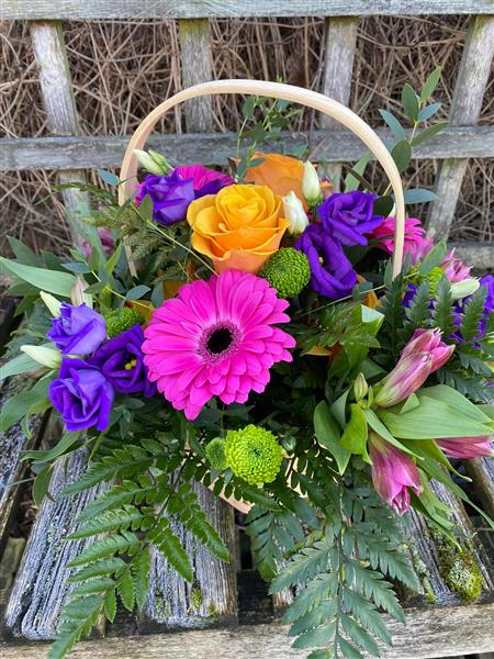 A vibrant basket arrangement bursting with colourful blooms. Featuring orange roses, purple lisianthus, and cheerful gerberas, this design brings instant warmth and joy to any space.